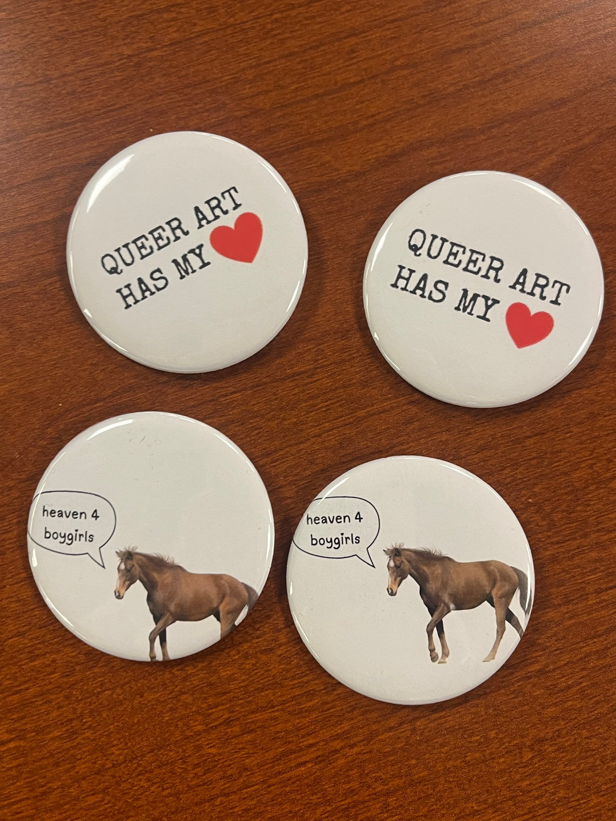 2 pins - queer art has my <3 and horsie pin in honor of issue 3 of heaven 4 boygirls